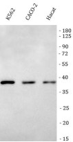 Western blot: K562, CACO-2, and Hacat stained with ARG45236 anti-MRPS22 antibody at 0.5 μg/ml dilution.