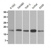 Western blot: 40 µg of 1) K-562, 2) SW480, 3) THP-1, 4) Jurkat, and 5) A549 cell lysates stained with ARG57149 anti-MTH1 antibody [3B3] at 1:500.