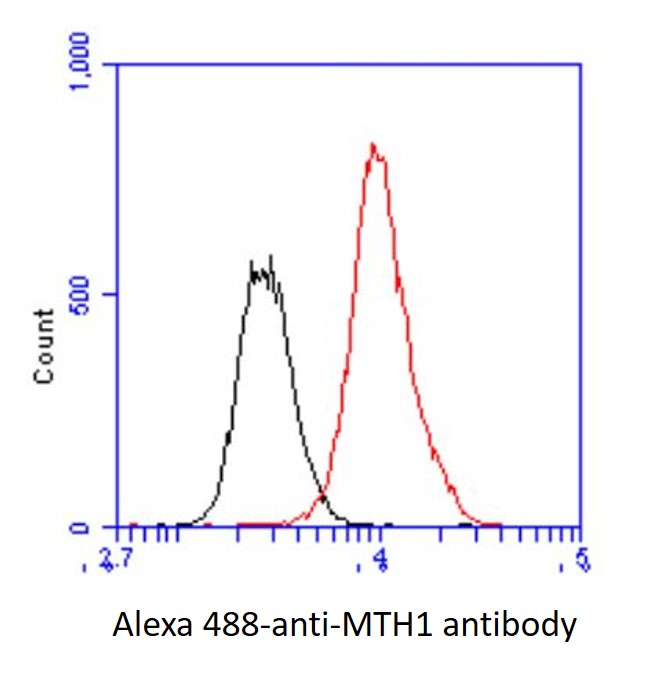 Flow Cytometry: Jurkat cell line stained with ARG57149 anti-MTH1 antibody [3B3] at 2-5 µg for 1x10^6 cells (red line). Secondary antibody: Goat anti-Mouse IgG Alexa fluor 488 conjugate. Isotype control antibody: Mouse IgG (black line).