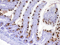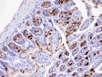 Immunohistochemistry: Paraffin-embedded Mouse small intestine tissue. Antigen Retrieval: Heat mediation was performed in Citrate buffer (pH 6.0, epitope retrieval solution) for 20 min. The tissue section was blocked with 10% goat serum. The tissue section was then stained with ARG41678 anti-MUC2 / Mucin 2 antibody at 1 µg/ml dilution, overnight at 4°C.