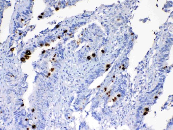 Immunohistochemistry: Paraffin-embedded Human rectal cancer tissue. Antigen Retrieval: Heat mediation was performed in Citrate buffer (pH 6.0, epitope retrieval solution) for 20 min. The tissue section was blocked with 10% goat serum. The tissue section was then stained with ARG41678 anti-MUC2 / Mucin 2 antibody at 1 µg/ml dilution, overnight at 4°C.