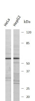Western blot: HeLa and HepG2 stained with ARG67107 anti-MUTYH antibody at 1:1000 dilution.
