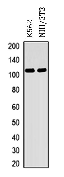 Western blot: K562 and NIH/3T3 whole cell lysates stained with ARG66553 anti-MYBL2 / B MYB antibody.