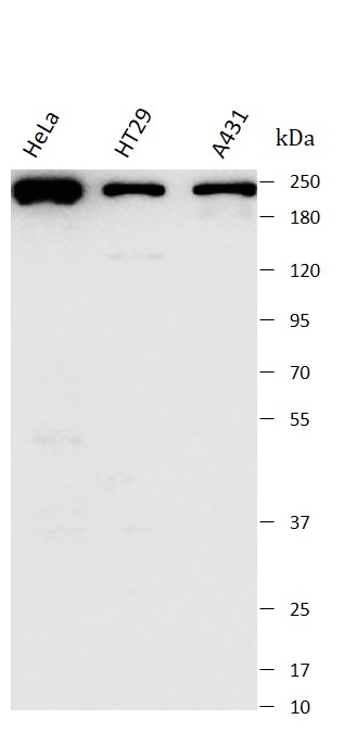 Western blot: HeLa, HT29, A431 stained with ARG44710 anti-MYH9 antibody at 1 µg/mL dilution.