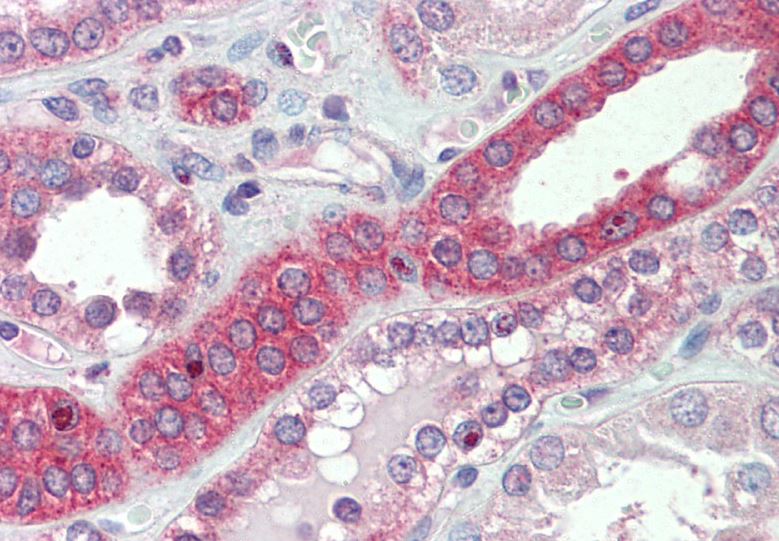 Immunohistochemistry: Paraffin-embedded Human kidney tissue. Antigen Retrieval: Steam tissue section in Citrate buffer (pH 6.0). The tissue section was stained with ARG42232 anti-MYO1H antibody at 5 µg/ml dilution followed by AP-staining.