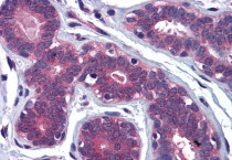 Immunohistochemistry: Paraffin-embedded Human breast tissue. Antigen Retrieval: Steam tissue section in Citrate buffer (pH 6.0). The tissue section was stained with ARG63429 anti-MYRIP / SLAC2C antibody at 3.75 µg/ml dilution followed by AP-staining.