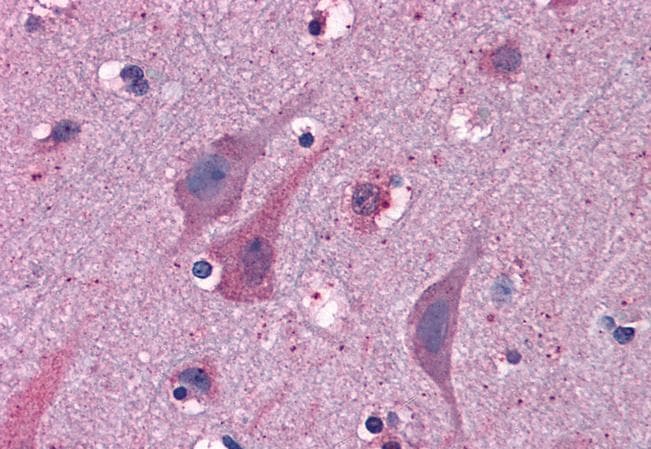 Immunohistochemistry: Paraffin-embedded Human cortex tissue. Antigen Retrieval: Steam tissue section in Citrate buffer (pH 6.0). The tissue section was stained with ARG63429 anti-MYRIP / SLAC2C antibody at 3.75 µg/ml dilution followed by AP-staining.