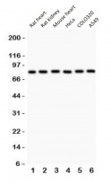 Western blot: 1) Rat heart, 2) Rat kidney, 3) Mouse heart, 4) HeLa, 5) COLO320, and 6) A549 cell lysates stained with ARG57977 anti-Mitofusin 1 antibody.