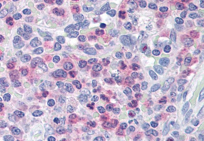 Immunohistochemistry: Paraffin-embedded Human spleen tissue. Antigen Retrieval: Steam tissue section in Citrate buffer (pH 6.0). The tissue section was stained with ARG63528 anti-Munc13-4 / UNC13D antibody at 5 µg/ml dilution followed by AP-staining.
