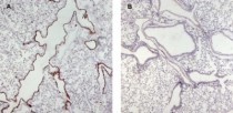 Immunohistochemistry: paraffin embedded Mouse Lung (wt in A and KO in B) . stained with ARG64034 anti-Munc13-4 / UNC13D antibody at 0.5 µg/ml dilution followed by