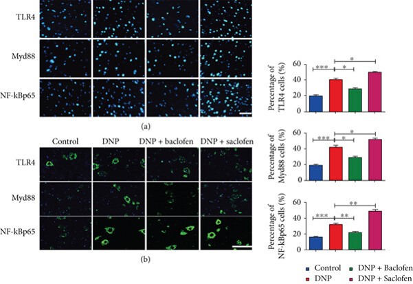 Immunofluorescence: Rat (L1–5) spinal cord stained with ARG54348 anti-MyD88 antibody and ARG51013 anti-NFkB p65 antibody.