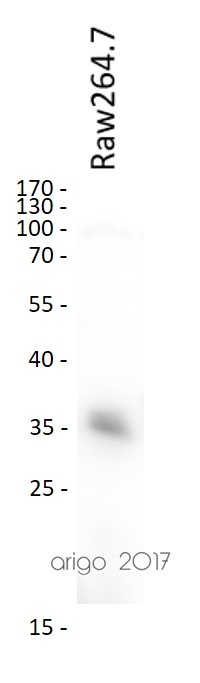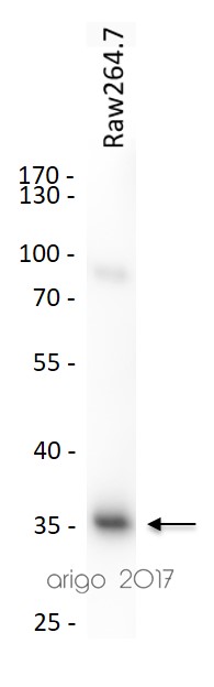 Western blot: 20 µg of Raw264.7 cell lysate stained with ARG54348 anti-MyD88 antibody at 1:500 dilution.