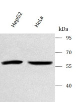 Western blot: HepG2 and Hela stained with ARG43962 anti-NAB1 antibody at 0.5 μg/mL dilution.