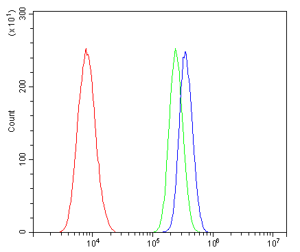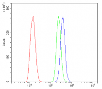Flow Cytometry: ANA-1 cells were blocked with 10% normal goat serum and then stained with ARG43140 anti-NADH2 / MT-ND2 antibody (blue) at 1 µg/10^6 cells for 30 min at 20°C, followed by incubation with DyLight®488 labelled secondary antibody. Isotype control antibody (green) was rabbit IgG (1 µg/10^6 cells) used under the same conditions. Unlabelled sample (red) was also used as a control.