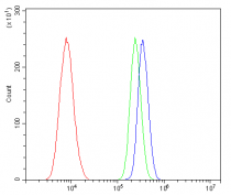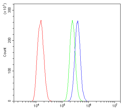 Flow Cytometry: NRK cells were blocked with 10% normal goat serum and then stained with ARG43140 anti-NADH2 / MT-ND2 antibody (blue) at 1 µg/10^6 cells for 30 min at 20°C, followed by incubation with DyLight®488 labelled secondary antibody. Isotype control antibody (green) was rabbit IgG (1 µg/10^6 cells) used under the same conditions. Unlabelled sample (red) was also used as a control.