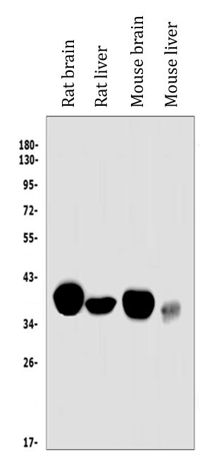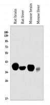 Western blot: 50 µg of sample under reducing conditions. Rat brain, Rat liver, Mouse brain and Mouse liver lysates stained with ARG43140 anti-NADH2 / MT-ND2 antibody at 0.5 µg/ml dilution, overnight at 4°C.