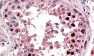 Immunohistochemistry: paraffin embedded Human Testis. (Steamed antigen retrieval with citrate buffer pH 6) stained with ARG64194 anti-NANOG antibody at 2 µg/ml dilution followed by AP-staining.