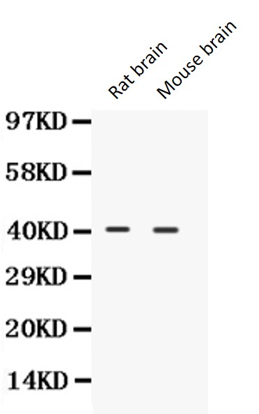 Western blot: 50 µg of Rat brain and Mouse brain lysates stained with ARG59460 anti-NDRG2 antibody at 0.5 µg/ml dilution.