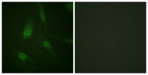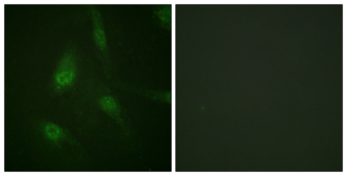 Immunofluorescence: HeLa cells stained with ARG66800 anti-NFATc3 phospho (Ser165) antibody. The picture on the right is blocked with the phospho peptide.