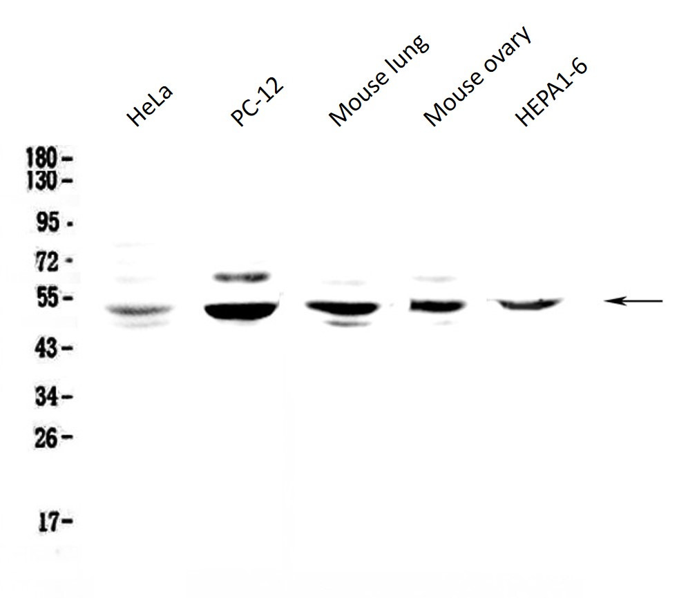 Western blot: 50 µg of samples under reducing conditions. HeLa, PC-12, Mouse lung, Mouse ovary and HEPA1-6 lysates stained with ARG59017 anti-NFIB / NF1B2 antibody at 0.5 µg/ml, overnight at 4°C.