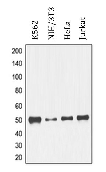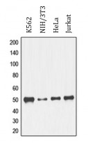 Western blot: K562, NIH/3T3, HeLa and Jurkat whole cell lysates stained with ARG66549 anti-NFYC antibody.