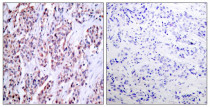 Immunohistochemistry: Paraffin-embedded Human breast carcinoma tissue stained with ARG51015 anti-NFkB p100 / p52 antibody (left) or the same antibody preincubated with blocking peptide (right).