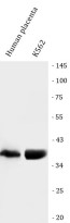 Western blot: Human placenta and K562 stained with ARG45708 anti-NMI / n Myc Interactor antibody at 0.5 μg/ml dilution.
