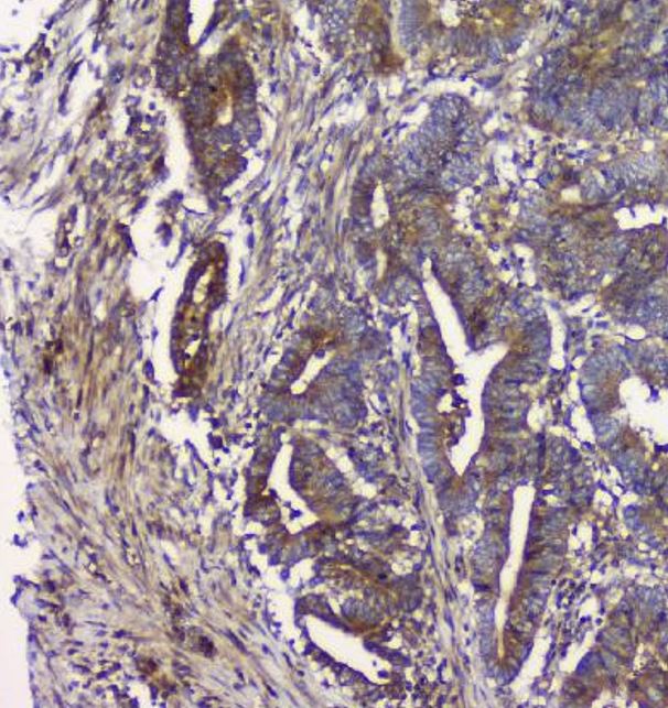 Immunohistochemistry: Human colon cancer stained with ARG45708 anti-NMI / n Myc Interactor antibody at 2 μg/ml dilution.