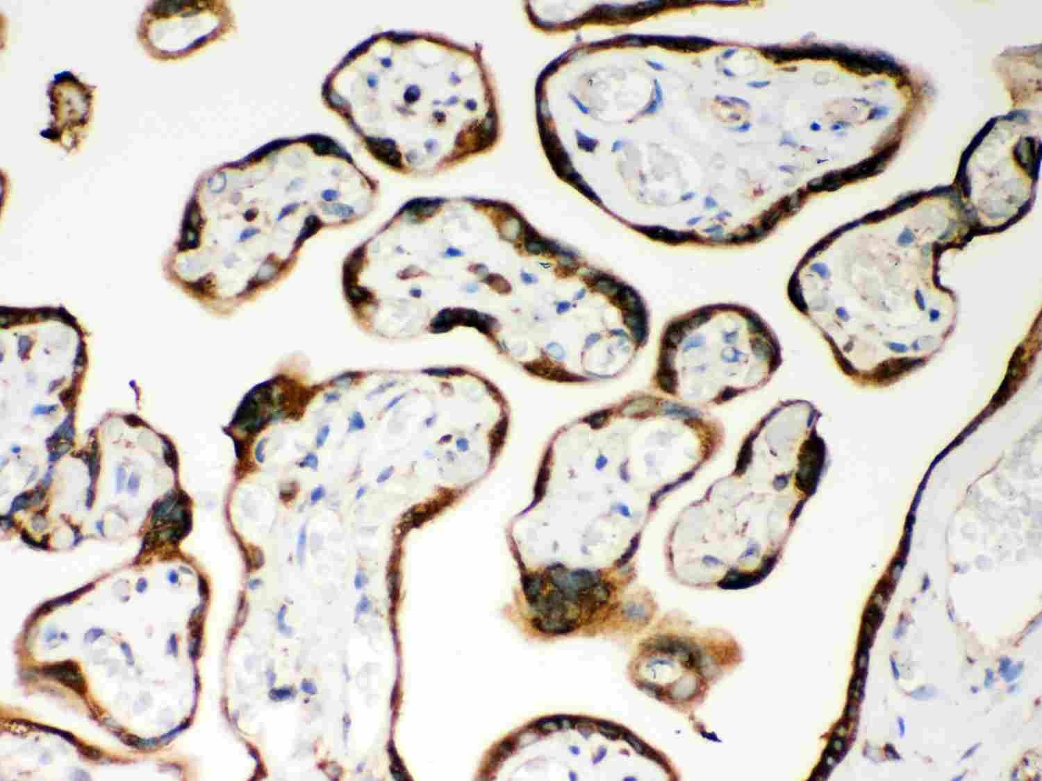 Immunohistochemistry: Paraffin-embedded Human placenta Tissue. Antigen Retrieval: Heat mediated was performed in Citrate buffer (pH 6.0, epitope retrieval solution) for 20 min. The tissue section was blocked with 10% goat serum. The tissue section was then stained with ARG59215 anti-NOD1 / CARD4 antibody at 1 µg/ml dilution, overnight at 4°C.