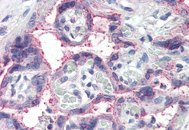 Immunohistochemistry: Paraffin-embedded Human placenta tissue. Antigen Retrieval: Steam tissue section in Citrate buffer (pH 6.0). The tissue section was stained with ARG63870 anti-Notch 3 antibody at 5 µg/ml dilution followed by AP-staining.