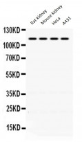 Western blot: 50 µg of samples under reducing conditions. Rat kidney, Mouse kidney, HeLa and A431 lysates stained with ARG59039 anti-NR3C2 / Mineralocorticoid Receptor antibody at 0.5 µg/ml, overnight at 4°C.