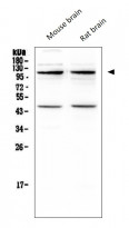 Western blot: 50 µg of samples under reducing conditions. Mouse brain and Rat brain lysates stained with ARG59039 anti-NR3C2 / Mineralocorticoid Receptor antibody at 0.5 µg/ml, overnight at 4°C.