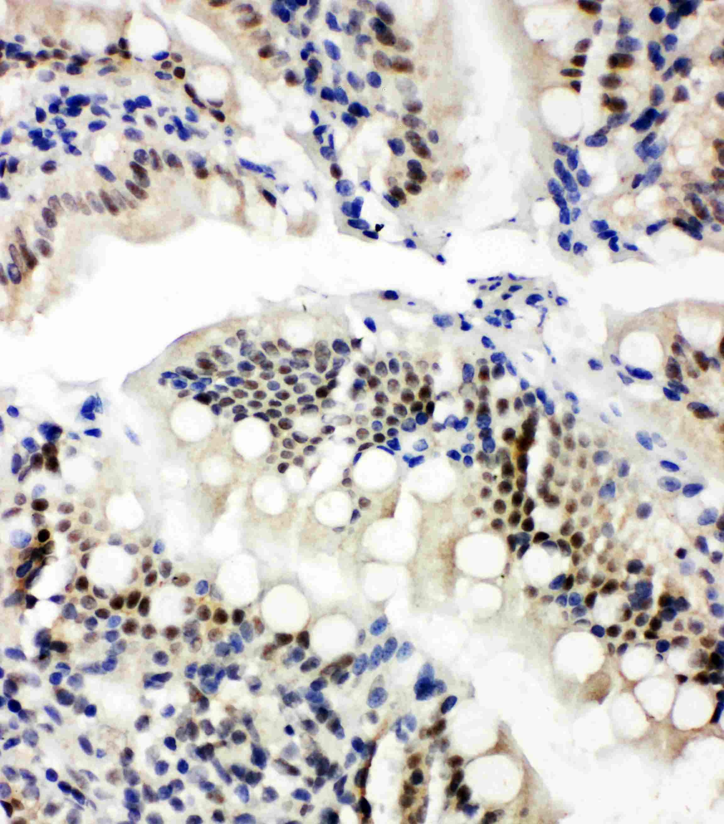 Immunohistochemistry: Paraffin-embedded Rat intestine tissue stained with ARG40699 anti-NRF1 antibody.