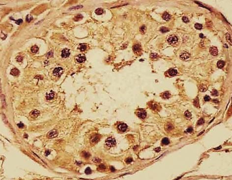 Immunohistochemistry: Paraformaldehyde-fixed and paraffin-embedded Human testis was blocked with 3% BSA for 0.5 hour at RT. Antigen Retrieval: Heat mediation was performed in Citrate buffer (pH 6.0). Samples were stained with ARG40146 anti-NSFL1C antibody at 1:25 for 1 hour at 37°C.