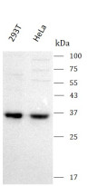 Western blot: 293T and HeLa stained with ARG44172 anti-NTHL1 antibody at 0.5 μg/mL dilution.