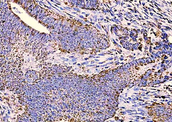 Immunohistochemistry: Human colorectal adenocarcinoma stained with ARG44173 anti-NTN3 antibody at 2 μg/mL dilution.