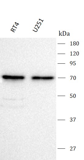 Western blot: RT4 and U251 stained with ARG44173 anti-NTN3 antibody at 0.5 μg/mL dilution.