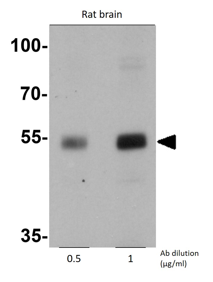Western blot: Rat brain tissue lysate stained with ARG59053 anti-NUCB2 / Nucleobindin 2 antibody at 0.5 or 1 µg/ml dilution.