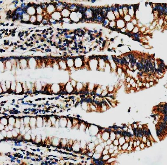 Immunohistochemistry: Human colon cancer stained with ARG45638 anti-NUDT8 antibody at 2 μg/ml dilution.