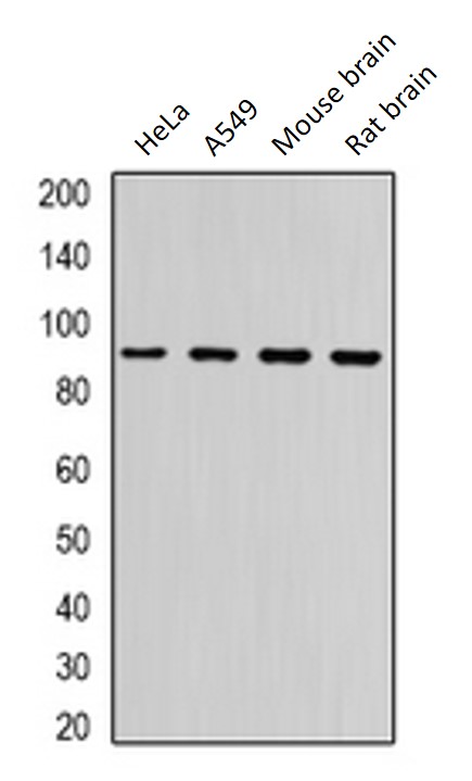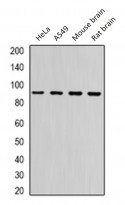 Western blot: HeLa, A549, Mouse brain and Rat brain lysates stained with ARG66463 anti-NLGN4Y / Neuroligin Y antibody.