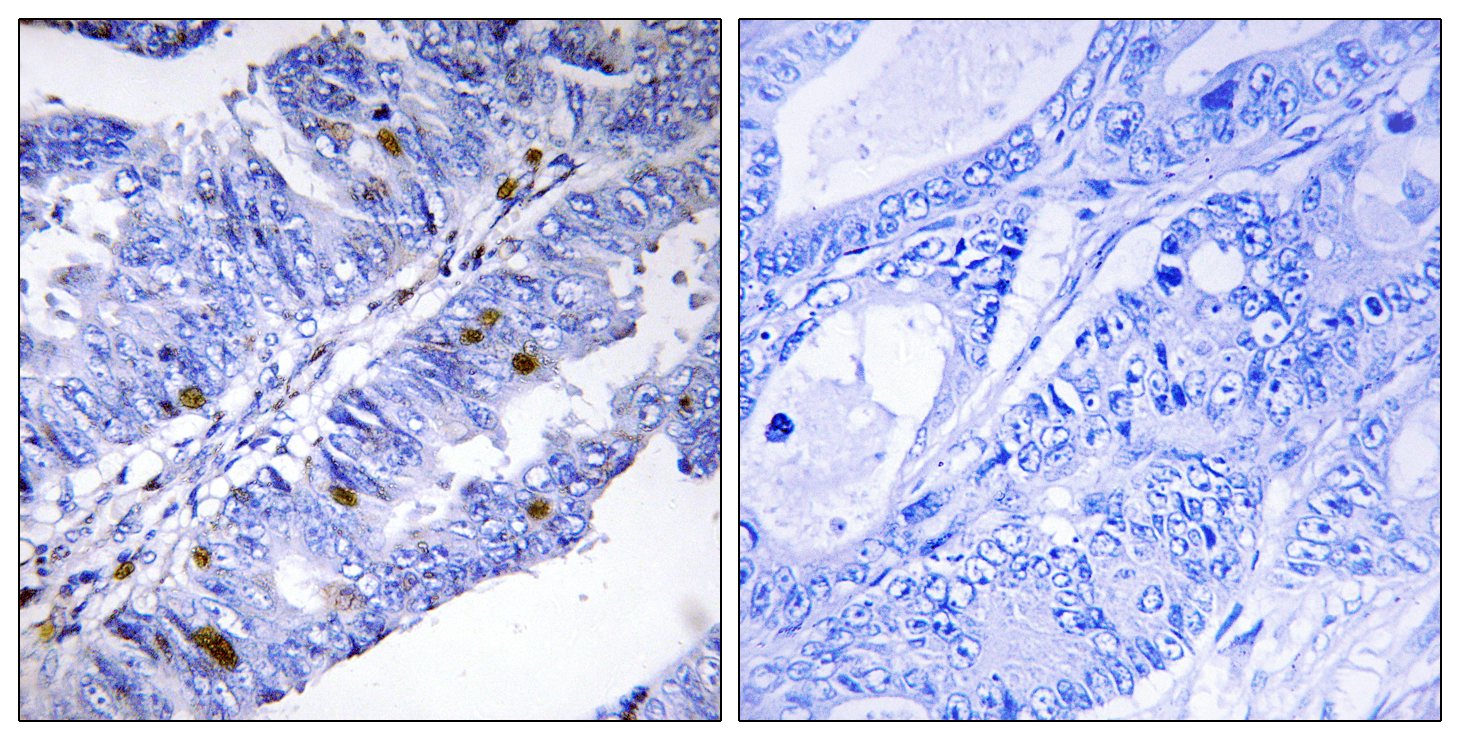 Immunohistochemistry: Paraffin-embedded Human colon carcinoma tissue stained with ARG66688 anti-Nur77 / TR3 phospho (Ser351) antibody. The picture on the right is blocked with the phospho peptide.