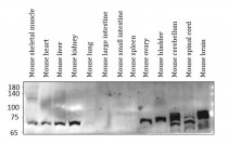Western blot: Mouse skeletal muscle, Mouse heart, Mouse liver, Mouse kidney, Mouse lung, Mouse large intestine, Mouse small intestine, Mouse spleen, Mouse ovary, Mouse bladder, Mouse cerebellum, Mouse spinal cord and Mouse brain lysates stained with ARG11088 anti-Nurr1 antibody at 1:500 dilution.