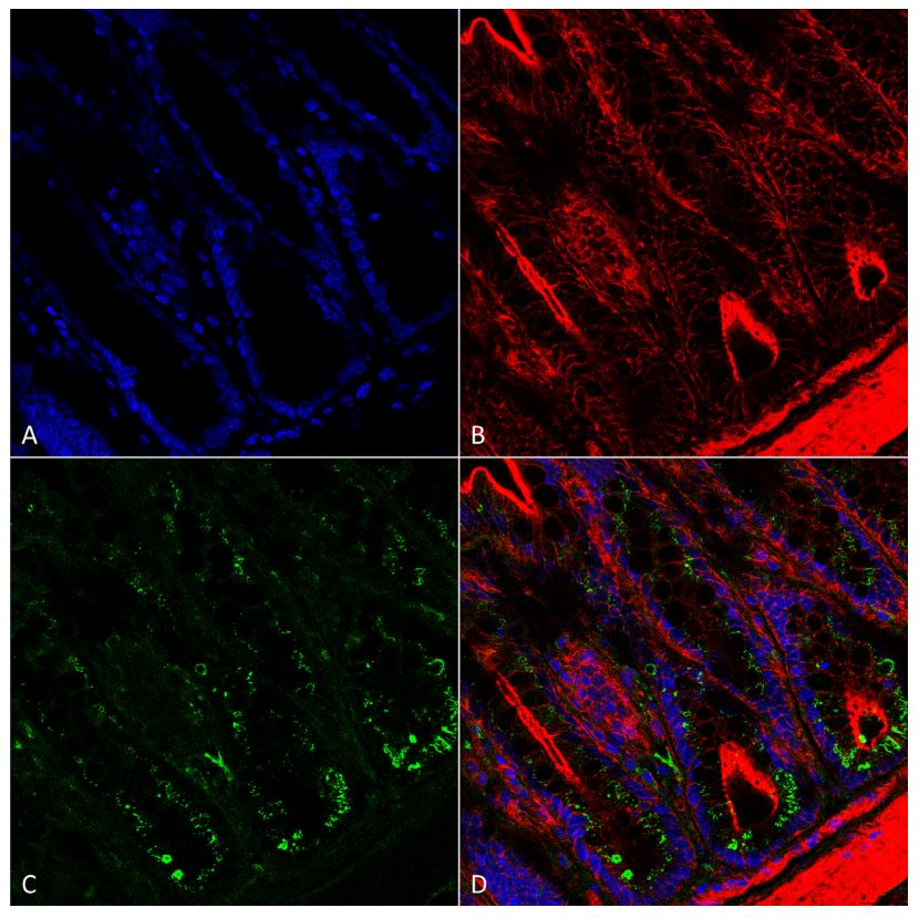 Immunohistochemistry: Formalin-fixed and paraffin-embedded Mouse colon tissue stained with ARG22636 anti-O-GalNAc + O-GlcNAc antibody [9B9] (green) at 1:25 dilution for 1 hour at RT. (A) DAPI (blue) for nuclear staining. (B) Phalloidin Alex Fluor 633 (red) for F-Actin staining. (C) Primary antibody. (D) Composite.