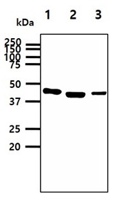Western blot: 1) 20 ng of OAT recombinant protein, 2) 40 ug of 293T cell lysate, and 3) 40 ug of Brain tissue lysate stained with ARG56993 anti-OAT antibody [23A2] at 1:1000.