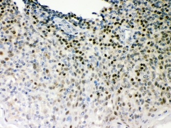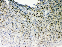 Immunohistochemistry: Paraffin-embedded Human tonsil tissue stained with ARG58130 anti-OCT1 antibody.