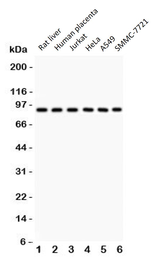 Western blot: Rat liver, Human placenta, Jurkat, HeLa, A549 and SMMC-7721 cell lysates stained with ARG58130 anti-OCT1 antibody.