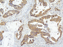 Immunohistochemistry: Paraffin-embedded Human rectal cancer tissue. Antigen Retrieval: Heat mediation was performed in Citrate buffer (pH 6.0) for 20 min. The tissue section was blocked with 10% goat serum. The tissue section was then stained with ARG43055 anti-OLFM4 antibody at 1 µg/ml dilution, overnight at 4°C.