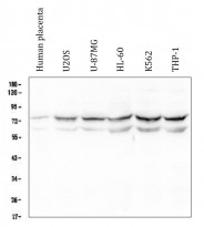 Western blot: 50 µg of sample under reducing conditions. Human placenta, U2OS, U-87MG, HL-60, K562 and THP-1 whole cell lysates stained with ARG43055 anti-OLFM4 antibody at 0.5 µg/ml dilution, overnight at 4°C.