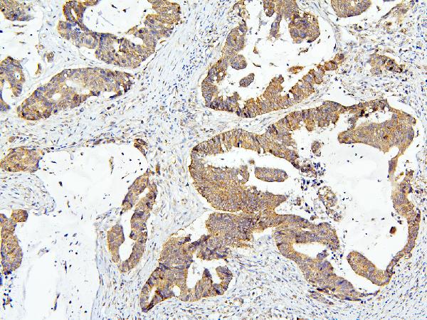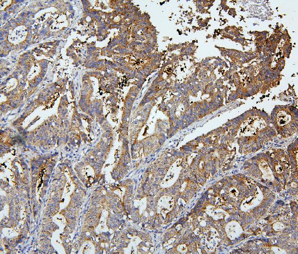 Immunohistochemistry: Paraffin-embedded Human colon cancer tissue. Antigen Retrieval: Heat mediation was performed in Citrate buffer (pH 6.0) for 20 min. The tissue section was blocked with 10% goat serum. The tissue section was then stained with ARG43055 anti-OLFM4 antibody at 1 µg/ml dilution, overnight at 4°C.