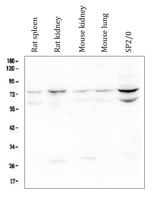 Western blot: 50 µg of sample under reducing conditions. Rat spleen, Rat kidney, Mouse kidney, Mouse lung and SP2/0 whole cell lysates stained with ARG43055 anti-OLFM4 antibody at 0.5 µg/ml dilution, overnight at 4°C.